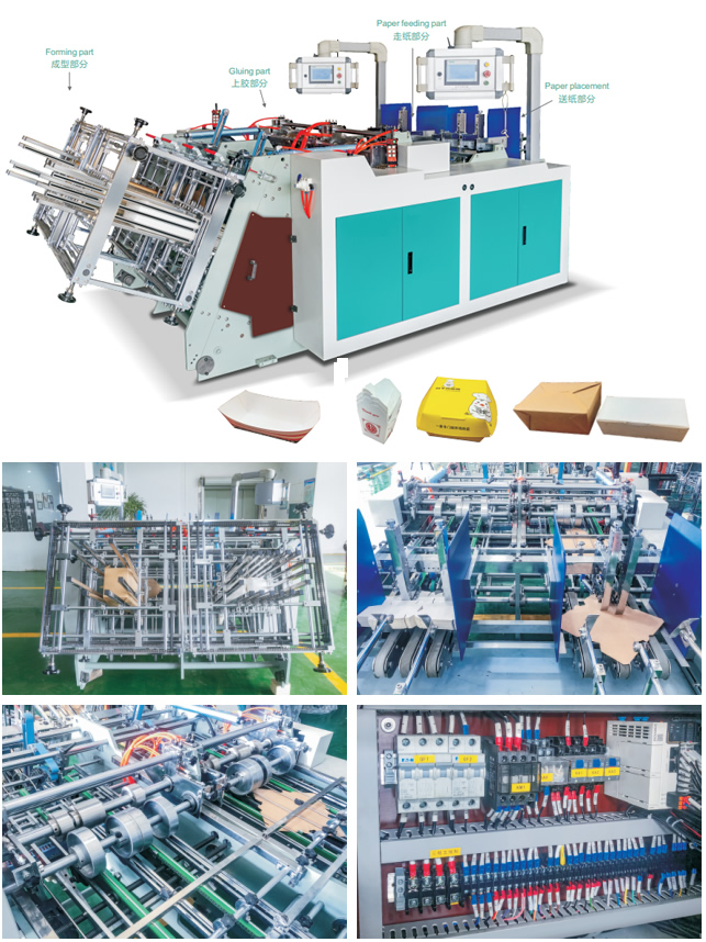 HS-HBJ-1400DL independent double station paper box making machine can make 2 different type of paper boxes at the same time, it can also start production independently. The completely separate design allows the entire machine to achieve independent gluing & forming, ensuring that there is no interference between the two stations, greatly improving production efficiency. This machine can be used to produce three-dimensional cardboard boxes such as hamburger boxes, packaging boxes, cake boxes, hardware boxes and so on.